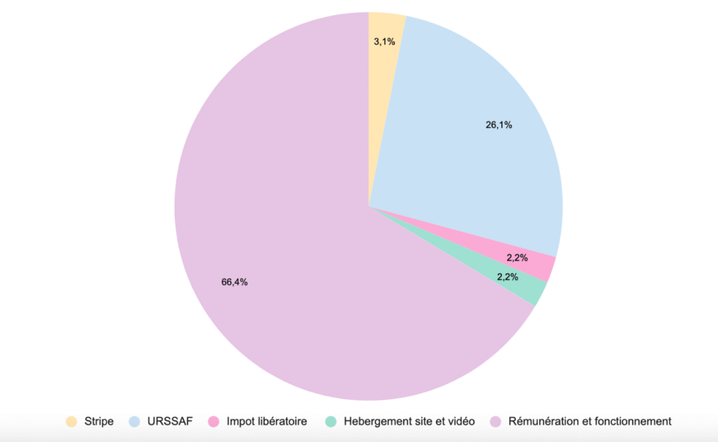 - 2.2% (0.33€) couvrent l’hébergement du site et plateforme numériques associés. Ceci est un coût fixe : elles ne dépendent pas du nombre d’abonnés (ici, j’ai imaginé 40 abonné•es pour les tarifs l’hébergement de 60€/an et 8€/an de vidéo).